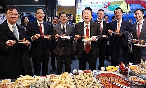 윤 대통령은 기업 총수들에게 직접 빈대떡을 나눠주고, 상인에게 "엄청 맛있습니다"라며 말을 건네기도 했다.