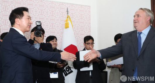 [서울=뉴스핌] 이형석 기자 = 김기현 국민의힘 대표와 인요한 혁신위원장이 6일 오후 서울 여의도 국회에서 열린 간담회를 앞두고 악수를 하고 있다. 2023.12.06 leehs@newspim.com 저작권자(c) 글로벌리더의 지름길 종합뉴스통신사 뉴스핌(Newspim), 무단 전재-재배포 금지