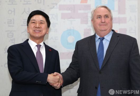 [서울=뉴스핌] 이형석 기자 = 김기현 국민의힘 대표와 인요한 혁신위원장이 6일 오후 서울 여의도 국회에서 열린 간담회를 앞두고 악수를 하고 있다. 2023.12.06 leehs@newspim.com
