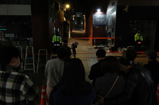 2022년 11월 3일 밤 서울 용산구 이태원동을 찾은 시민들이 참사가 발생한 골목을 바라보고 있다. [사진=뉴시스] |