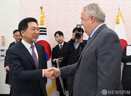 [서울=뉴스핌] 이형석 기자 = 김기현 국민의힘 대표와 인요한 혁신위원장이 6일 오후 서울 여의도 국회 당대표실에서 간담회에 앞서 악수 하고 있다. 2023.12.06 leehs@newspim.com 저작권자(c) 글로벌리더의 지름길 종합뉴스통신사 뉴스핌(Newspim), 무단 전재-재배포 금지