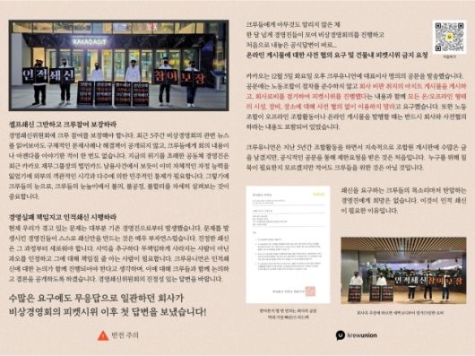 카카오가 노동조합에 회사와 사전협의 없는 활동은 삼가달라는 취지 공문을 보냈습니다. 이는 회사가 카카오 노조 활동에 대해 내놓은 첫 공식 답변으로, 지난 4일 이뤄진 사내 피켓 시위에 대한 반응이기도 하죠. 카카오 노조는 올해 상반기부터 시위 등 다양한 방식을 통해 회사에 인적 쇄신과 해당 논의 과정에서의 크루(직원) 참여 보장을 요구해 온 바 있습니다.