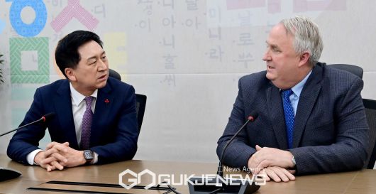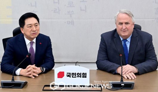 (서울=국제뉴스) 김기현(왼쪽) 국민의힘 대표와 인요한 혁신위원장이 6일 오후 서울 여의도 국회에서 회동,대화를 나누고 있다./사진=이용우기자
