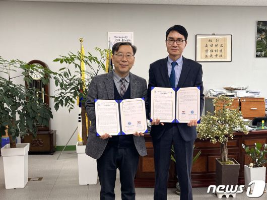 6일 이영진 공주대 산업과학대학장(왼쪽)과 오기식 우성 전무가 국내 양어용 배합 사료 기술 개발 협약을 체결한 뒤 기념촬영을 하고 있다. (공주대 제공) / 뉴스1 |