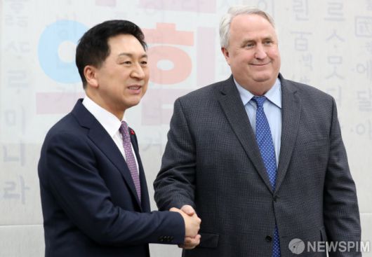 [서울=뉴스핌] 이형석 기자 = 김기현 국민의힘 대표와 인요한 혁신위원장이 6일 오후 서울 여의도 국회에서 열린 간담회를 앞두고 악수를 하고 있다. 2023.12.06 leehs@newspim.com 저작권자(c) 글로벌리더의 지름길 종합뉴스통신사 뉴스핌(Newspim), 무단 전재-재배포 금지