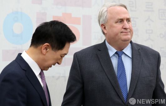 [서울=뉴스핌] 이형석 기자 = 김기현 국민의힘 대표(왼쪽)와 인요한 혁신위원장이 6일 국회 당대표실에서 인사를 나눈 후 굳은 표정을 짓고 있다. 2023.12.06 leehs@newspim.com 저작권자(c) 글로벌리더의 지름길 종합뉴스통신사 뉴스핌(Newspim), 무단 전재-재배포 금지