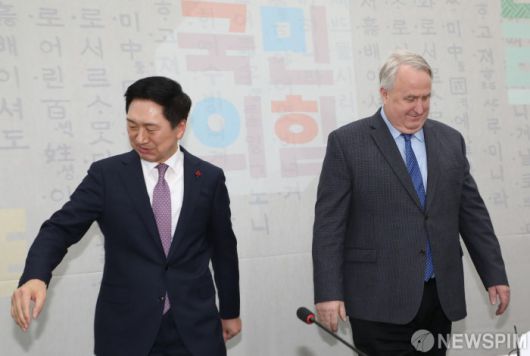 [서울=뉴스핌] 이형석 기자 = 김기현 국민의힘 대표(왼쪽)와 인요한 혁신위원장이 6일 국회 당대표실에서 만나 악수를 나눈 후 자리에 앉고 있다. 2023.12.06 leehs@newspim.com 저작권자(c) 글로벌리더의 지름길 종합뉴스통신사 뉴스핌(Newspim), 무단 전재-재배포 금지