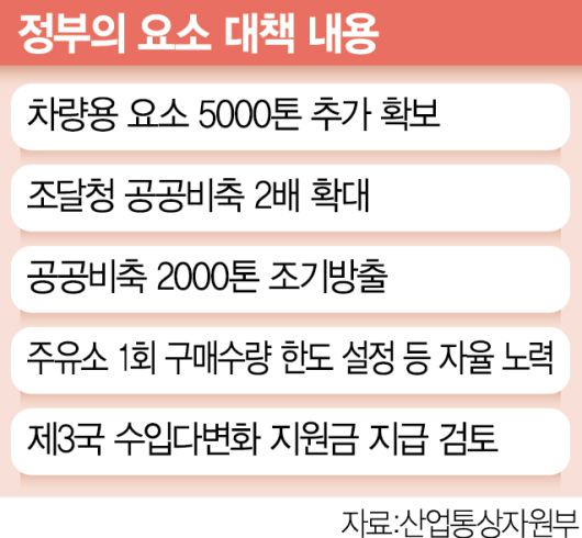 정부는 6일 김병환 기획재정부 1차관 주재로 ‘경제안보 핵심 품목 태스크포스(TF)’ 회의를 열고 △차량용 요소 5000톤 추가 확보 △조달청 공공 비축 2배 확대 △공공 비축 물량 2000톤 조기 방출 △주유소 1회 구매 수량 한도 설정 등 자율 노력 △통관 지연 물량 신속 도입 △제3국 수입 다변화 지원금 지급 검토 △공급망 기본법 국회 통과 등의 대책을 추진하겠다고 발표했다.