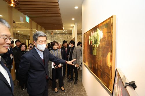 (포항=연합뉴스) 손대성 기자 = 장애인표준사업장 자의누리와 동국제강 포항공장은 6일 경북 포항 서밋컨벤션에서 포항 장애인 미술작가 교류전 개막식을 하고 전시에 들어갔다.