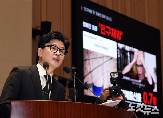 한동훈 법무부 장관은 6일 국민의힘 정책의원총회에 참석해 "우리나라 인구 문제는 추세를 볼 때 위기를 넘어 재앙이라고 해도 과언이 아니다"라며 가칭 '출입국이민관리청' 신설 필요성을 강조했다.