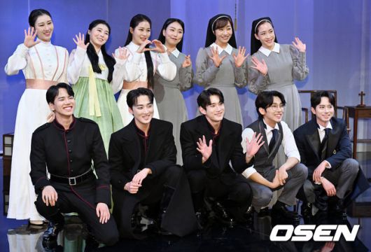 [OSEN=민경훈 기자] 6일 오후 서울 중구 충무아트센터 중극장 블랙에서 뮤지컬 '리진 : 빛의 여인' 프레스콜이 진행됐다. 프레스콜을 마친 후 배우들이 무대 위에서 단체 포토타임을 갖고 있다. 2023.12.06 / rumi@osen.co.kr