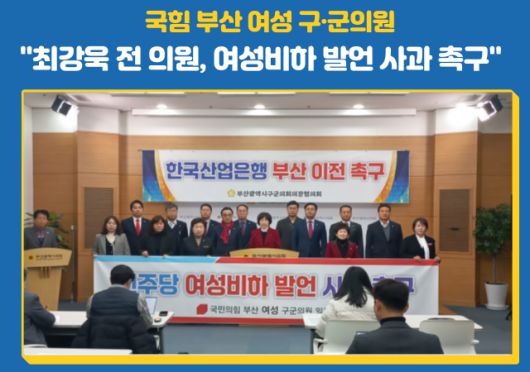 내년 총선을 앞두고 공개행사에서 막말과 여성비하 발언으로 논란이 거세지고 있는 가운데 국민의힘 부산시 여성 구·군 의원들이 여성 폄하 발언에 대해 진심어린 반성과 사과를 촉구하고 나섰다.