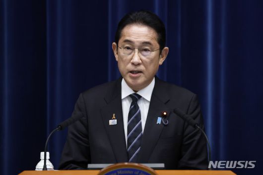 [도쿄=AP/뉴시스]일본 총리이자 집권 자민당의 총재인 기시다 후미오(岸田文雄)는 6일 당내 파벌에게 정치자금 모금 파티를 당분간 자제하라고 지시했다. 도쿄지검이 이들의 해당 파티와 관련한 정치자금 수사를 확대하고 있기 때문이다. 사진은 기시다 총리가 지난딜 2일 도쿄 총리 관저에서 기자회견을 하고 있는 모습. 2023.12.06. |