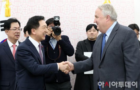 아시아투데이 이병화 기자 = 김기현 국민의힘 대표와 인요한 혁신위원장이 6일 국회에서 열린 간담회에 앞서 악수를 나누고 있다.