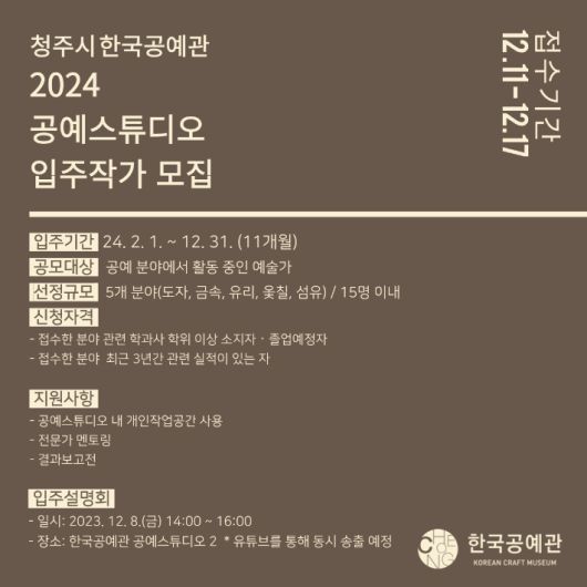 충북 청주시한국공예관이 내년 공예스튜디오 입주 작가를 오는 11~17일 모집한다.