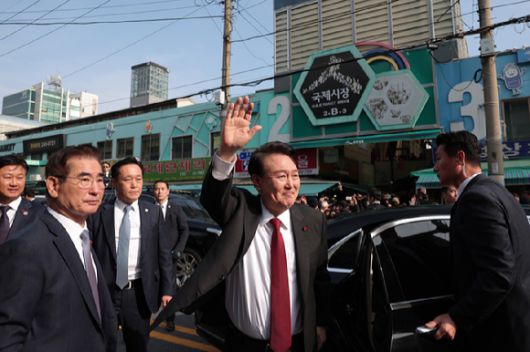 윤 대통령은 간담회를 마친 뒤 부산의 대표 전통시장인 국제시장을 찾아 시민들과 소통했다. 윤 대통령 취임 이후 국제시장 방문은 이번이 처음이다. 시장 방문 후엔 인근 시장에서 기업인들을 포함한 간담회 참석자들과 오찬을 함께했다.