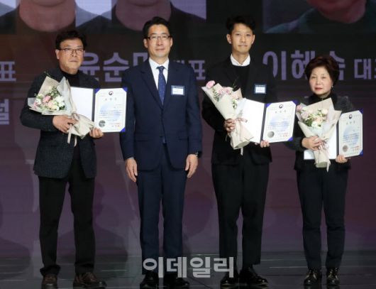 [이데일리 김태형 기자] 6일 서울 대치동 섬유센터에서 열린 '2023 대한민국 패션대상' 행사에서 삼진어패럴 윤병민(왼쪽 첫번째) 대표, 비에파 윤순민(세번째) 대표, 늘봄 이혜숙(네번째) 대표가 봉제산업 유공자부문에서 산업통상자원부 장관 표창을 수상하고 있다.