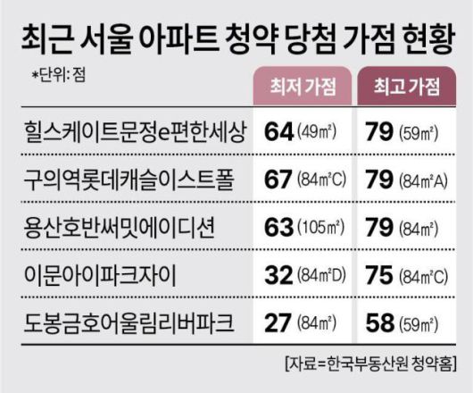 지난 10월 강동구에서 분양한 '천호역마에스트로'의 경우 22점이 최저 당첨가점이었고, 4300가구 규모의 대단지인 동대문구 '이문아이파크자이'도 최저 당첨가점이 32점에 그쳤다.