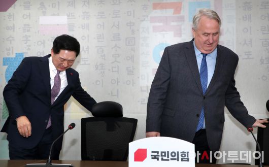 아시아투데이 이병화 기자 = 김기현 국민의힘 대표와 인요한 혁신위원장이 6일 국회에서 열린 간담회에 참석하고 있다.