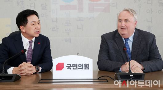 아시아투데이 이병화 기자 = 김기현 국민의힘 대표와 인요한 혁신위원장이 6일 국회에서 열린 간담회에서 대화를 나누고 있다.