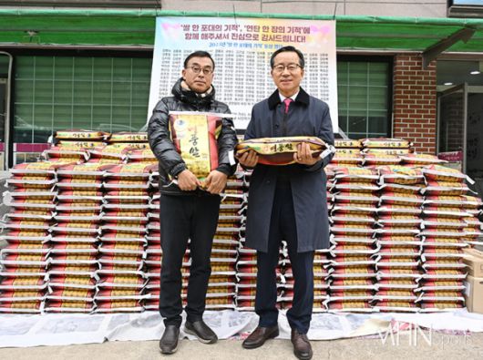 골프관계자들이 함께한 '쌀 한 포대의 기적, 연탄 한 장의 기적' 연말 자선 기부 행사가 6일 오전 고양시 대자동 벧엘교회에서 진행됐다. 이날 서원밸리CC 이석호 대표(오른쪽), 정석천 상무가 전달식에서 포즈를 취하고 있다. |