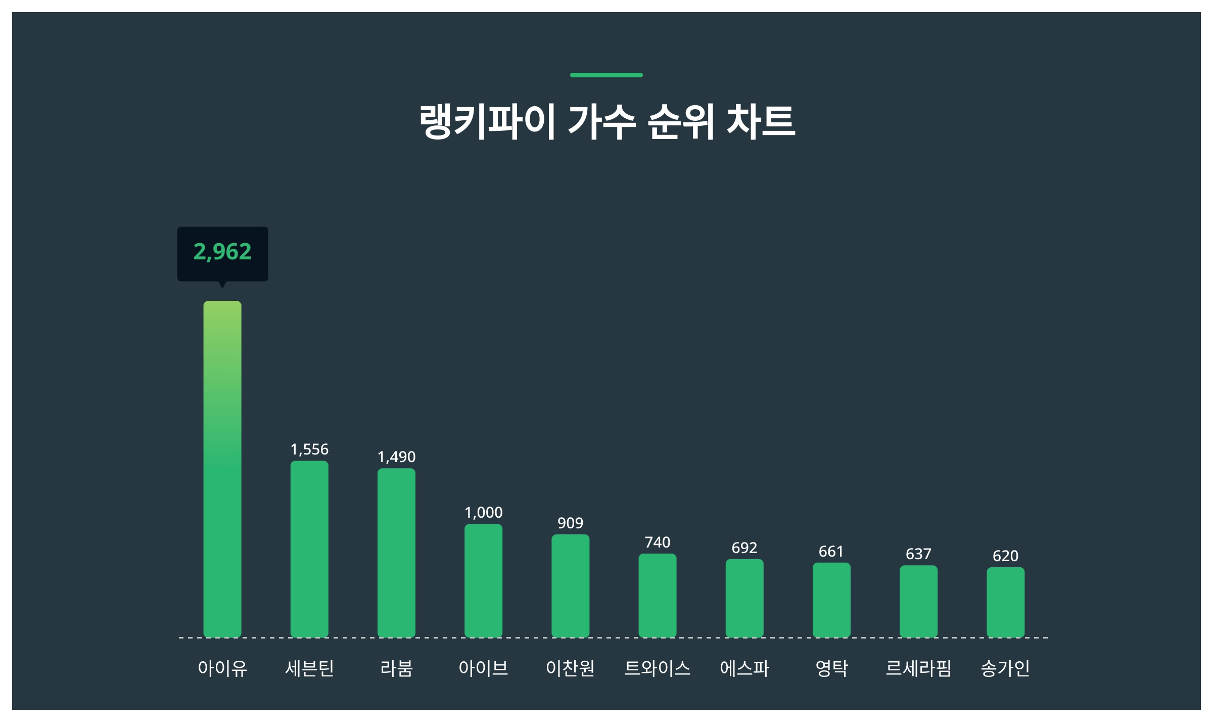 아이유 ⓒ스타데일리뉴스 [스타데일리뉴스=서태양 기자] 아이유가 2023년 12월 6일 공개된 랭키파이의 가수부문 트랜드지수 분석 결과 1위에 올랐다.랭키파이 (2023년 12월 6일) 가수부문 트랜드지수를 분석한 지표이다. 기사제보 및 보도자료 news@stardailynews.co.kr <저작권자 Copyright ⓒ 스타데일리뉴스. 무단전재 및 재배포 금지>