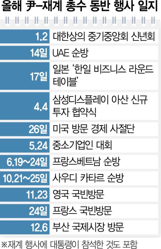윤 대통령이 재계 총수들을 동원한 소위 ‘편대비행’은 이번이 처음이 아니다. 해외 순방 때마다 경제사절단으로 기업인들이 동행했다. 올해만 윤 대통령과 재계 총수들은 11차례 이상 만났다. 1월 대한상의·중기중앙회 신년회처럼 대통령이 참석해 행사를 빛내는 방식뿐 아니라 해외 순방에만 6차례(1월 UAE 순방, 3월 ‘한일 비즈니스 라운드 테이블’, 4월 미국 방문, 6월 프랑스·베트남 순방, 10월 사우디·카타르 순방, 11월 영국·프랑스 순방) 동원됐다. 윤 대통령 취임 이후 이 회장이 공식적으로 만난 횟수만 17회다.