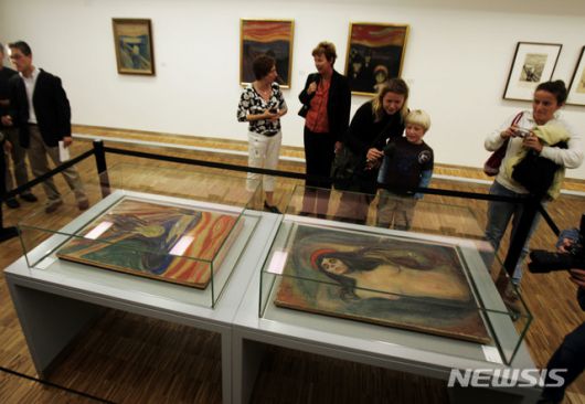 [오슬로=AP/뉴시스] 노르웨이 오슬로에 있는 뭉크미술관의 비르기테 아가 혁신·연구 책임자는 기술 전문업체인 타타컨설팅서비스(TCS)와 함께 머신러닝 알고리즘을 개발해 관람객에게 뭉크 컬렉션을 기반으로 한 실시간 드로잉 경험을 제공할 계획이라고 밝혔다. 사진은 2006년 9월26일 노르웨이 오슬로에 있는 뭉크미술관에 전시된 에드바르 뭉크의 걸작 '절규'(왼쪽)와 '마돈나'(오른쪽). 2023.12.06. |