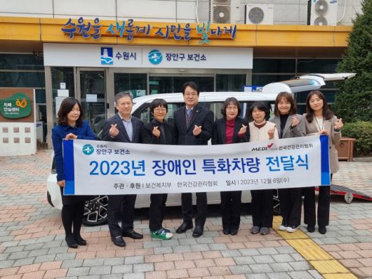 시에 따르면 6일 장안구보건소에서 열린 전달식에는 김계환 한국건강관리협회 경기지부본부장, 권명희 수원시 장안구보건소장 등이 참석했다. 장애인 특화 개조차량은 3인승으로 휠체어 1석, 일반 2석으로 구성됐고, 휠체어 전동발판을 갖췄다.