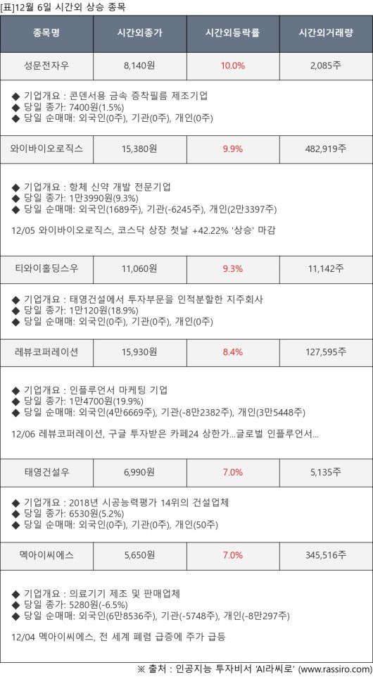[서울=뉴스핌] 로보뉴스 = 12월 6일, 인공지능 투자비서 ‘AI라씨로’는 시간외 단일가 매매에서 크게 상승한 성문전자우(014915), 와이바이오로직스(338840) 등에 대해 최근 동향을 분석했다.
