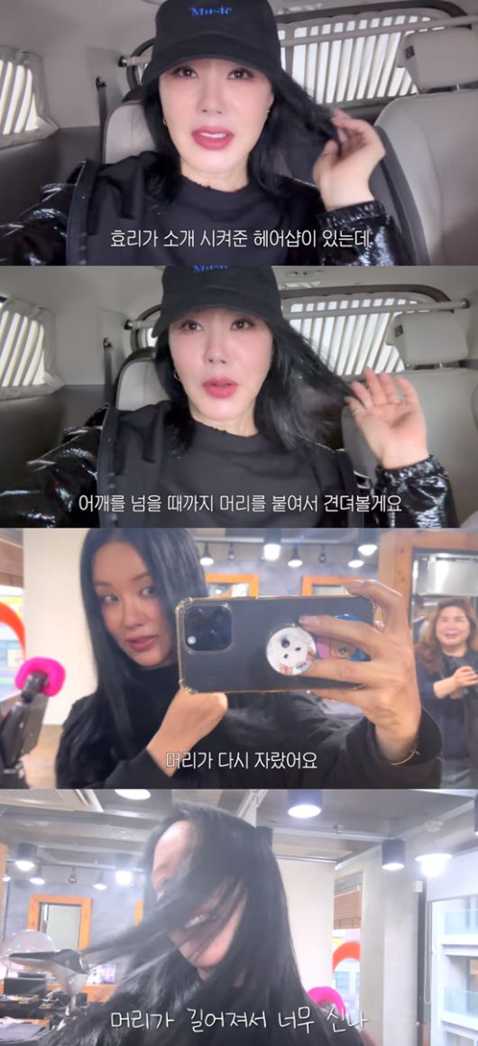 붙임머리를 완성한 엄정화는 "머리가 다시 자랐다. 이렇게 많이. 너무 예쁘다. 자연스럽게 머리가 다시 길어졌다"며 만족감을 드러냈다.