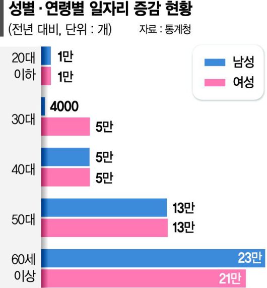 지난해 늘어난 87만개 일자리 가운데 노인 일자리가 절반을 차지했다. 같은 기간 청년 일자리는 1% 수준인 1만개 증가했다.