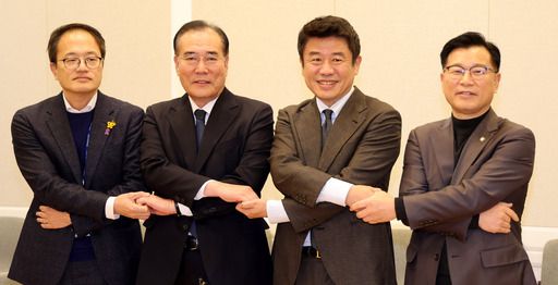 여야 정책위의장과 원내수석부대표가 참여하는 ‘2+2 협의체’ 첫 회의가 열린 6일 국회에서 만난 참가자들이 회의 전 포즈를 취하고 있다. 왼쪽부터 더불어민주당 박주민 원내수석부대표, 이개호 정책위의장, 국민의힘 유의동 정책위의장, 이양수 원내수석부대표. 이제원 선임기자 ⓒ 세상을 보는 눈, 세계일보