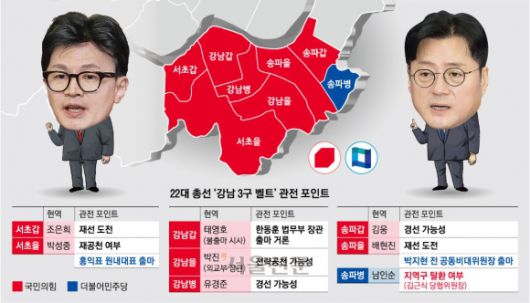송파는 강남벨트 가운데 그나마 민주당 세가 강한 곳이다. 송파병은 강남벨트에서 유일하게 민주당 깃발을 꽂은 남인숙 의원이 자리를 지키고 있다. 송파을은 친윤(친윤석열) 초선 배현진 의원의 지역구인데, 배 의원은 최근 당무감사에서 원내 현역 1위에 오른 것으로 전해져 출마가 확실시된다는 관측이다.