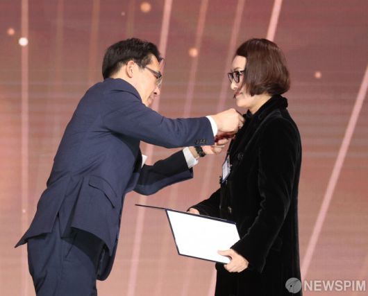 [서울=뉴스핌] 이호형 기자 = 이용필 산업부 첨단산업정책관이 6일 오후 서울 대치동 섬유센터에서 열린 2023 대한민국 패션대상에서 미스지콜렉션 지춘희 대표에게 대통령 표창을 수여한 후 벳지를 달아주고 있다.2023.12.06 leemario@newspim.com 저작권자(c) 글로벌리더의 지름길 종합뉴스통신사 뉴스핌(Newspim), 무단 전재-재배포 금지
