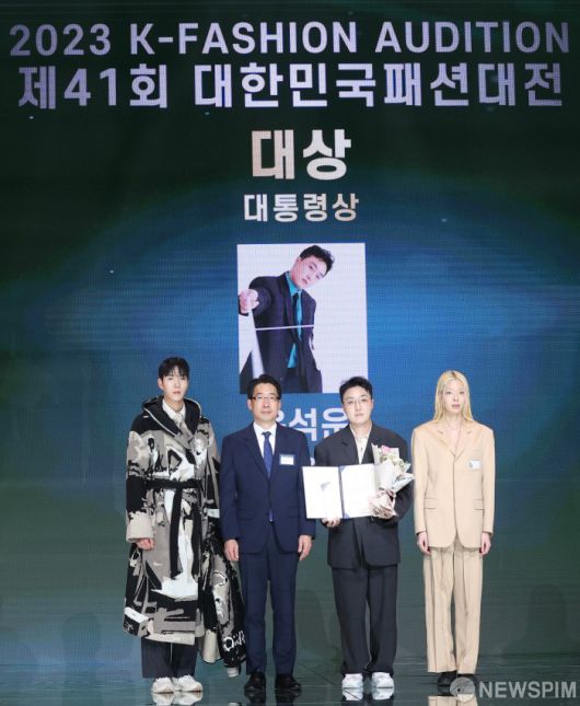 [서울=뉴스핌] 이호형 기자 = 이용필 산업부 첨단산업정책관이 6일 오후 서울 대치동 섬유센터에서 열린 2023 대한민국 패션대상 제41회 패션대전에서 윤석운 대표에게 대통령 상을 수여한 후 기념촬영을 하고 있다.2023.12.06 leemario@newspim.com 저작권자(c) 글로벌리더의 지름길 종합뉴스통신사 뉴스핌(Newspim), 무단 전재-재배포 금지