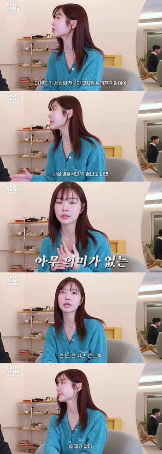 이날 반지 리뷰를 마친 레이디제인은 "반지를 볼 때는 이 반지가 세상의 전부인 것처럼 느껴진다"면서도 "사실 결혼식만 딱 끝나고 나면 아무 의미가 없는 물건으로 전락한다"고 견해를 밝혔다.