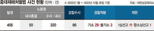 실제 검찰은 중대재해처벌법 사건의 91%(32건 중 29건)에 대해 기소처분을 내렸고, 법원은 선고한 12개 사건에서 모두 형사책임을 묻는 판결을 내린 것으로 나타났다.