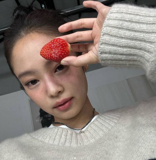 공개된 사진 속에는 다소 울적한 모습의 제니가 딸기를 들고 셀카를 촬영하고 있다.