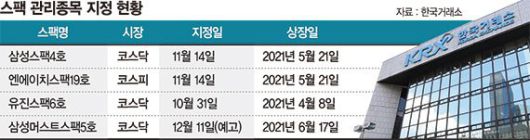 관리종목 지정이 임박한 스팩도 확인된다. 거래소는 지난 1일 삼성머스트스팩5호에 대해 오는 8일까지 상장예비심사서를 제출하지 않을 경우 11일부터 관리종목으로 지정된다고 예고했다. 하지만 지금까지도 상장예비심사서를 제출하지 않은 상태다.