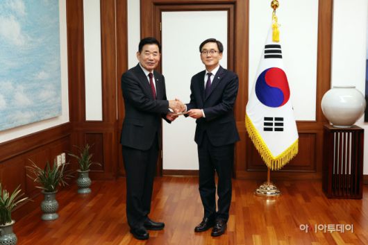 김진표 국회의장(사진 왼쪽)이 5일 서울 영등포구 국회의장 집무실에서 이상천 대한적십자사 사무총장(사진 오른쪽)에게 2024년도 적십자 특별회비를 전달하고 있다./국회사무처 |