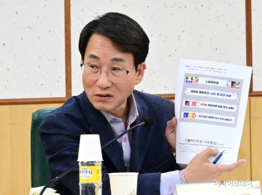 이원욱 더불어민주당 의원이 지난달 19일 국회 의원회관에서 열린 '원칙과 상식 1. 민심소통: 청년에게 듣는다' 토론회에서 '2023 새로운 민주당 캠페인: 현수막 시안을 들고 발언하고 있다./이병화 기자 |