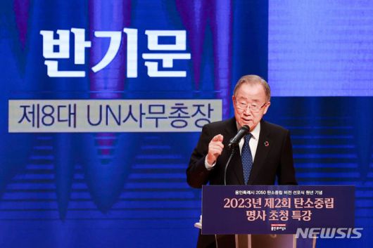[용인=뉴시스] 5일 용인시 에이스홀에서 열린 제2회 탄소중립 명사특강에서 반기문 전 유엔사무총장이 강연을 하고 있다.(사진=용인시 제공)2023.12.06. sonanom@newsis.com |
