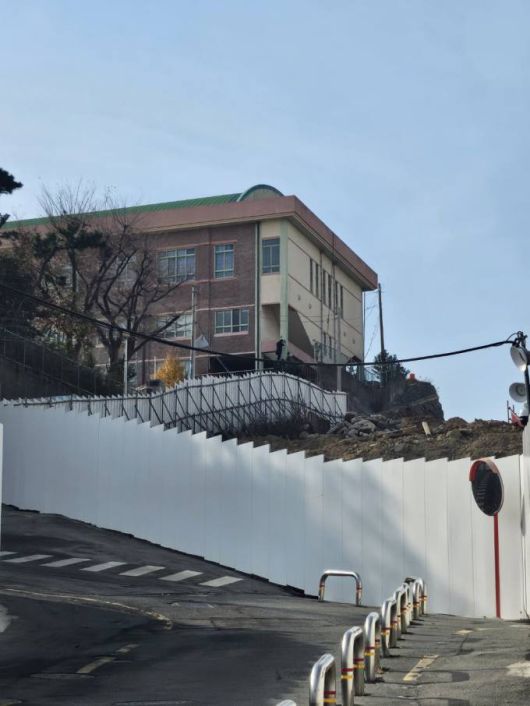 기자가 방문했을 때 학생들의 통학로와 공사 현장은 벽 하나로 구분되어 있었다. 특히 바람이 강하게 부는 부산 지역의 특수성을 감안할 때 벽 하나는 학생들의 안전을 보장하기에는 어림도 없어 보였다.