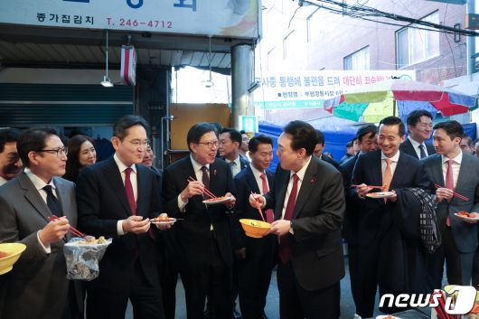(서울=뉴스1) 오대일 기자 = 윤석열 대통령이 6일 부산 중구 깡통시장을 방문해 박형준 부산시장, 이재용 삼성전자 회장 등 기업인들과 함께 분식을 시식하고 있다. (대통령실 제공) 2023.12.6/뉴스1