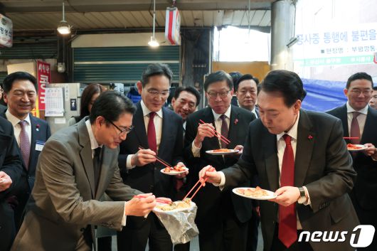 (서울=뉴스1) 오대일 기자 = 윤석열 대통령이 6일 부산 중구 깡통시장을 방문해 기업인들과 함께 분식을 시식하고 있다. 왼쪽부터 조현준 효성그룹 회장, 이재용 삼성전자 회장, 박형준 부산시장, 윤 대통령. (대통령실 제공) 2023.12.6/뉴스1kkorazi@news1.krCopyright ⓒ 뉴스1. All rights reserved. 무단 전재 및 재배포, AI학습 이용 금지.