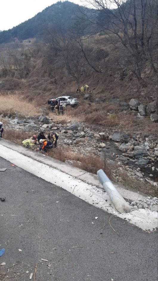 6일 오후 2시께 경북 영천시 화북면 한 내리막 도로에서 70대 남성이 운전하던 아반떼 승용차가 4m 아래 개울가로 추락했다.