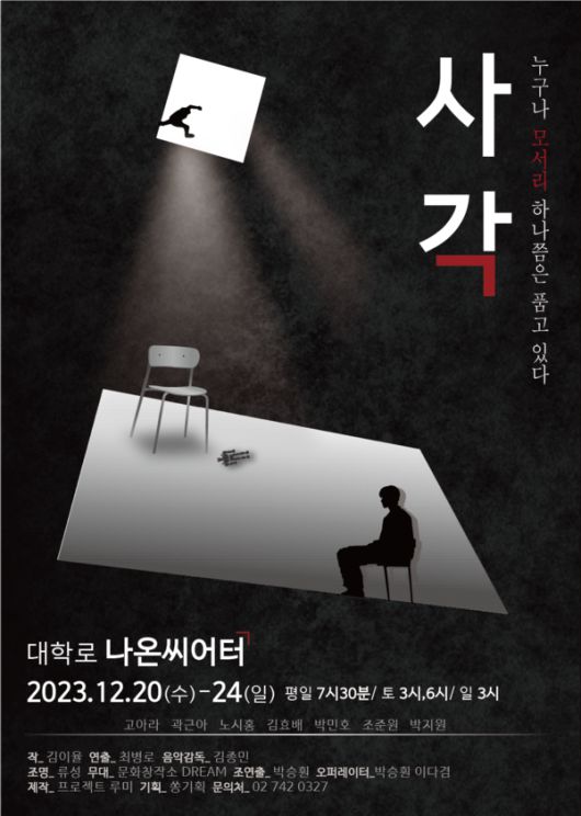 2023년 서울연극제 공식참가작 <믿을지 모르겠지만>으로 독특한 글감각을 인정 받은 김이율 작가와 연극 <하이타이>로 1인극의 진가를 보여준 최병로 연출이 의기투합한 작품 <사각> (부제: 누구나 모서리 하나쯤은 품고 있다) 이 크리스마스 즈음에 올라간다.