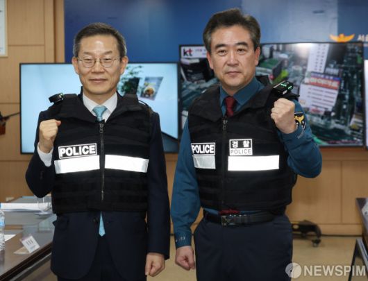 [서울=뉴스핌] 양윤모 기자 = 디지털 기술기반 범죄예방기술 시연 및 MOU행사가 6일 오후 서울 도봉경찰서에서 개최된 가운데 이종호 과학기술정보통신부 장관과 윤희근 경찰청장이 네트워크 신호정보를 활용한 긴급구조 정밀측위 기술 시연하기전 차세대 방검 외근조끼를 착용해 보고 있다.이번 행사는 '과학기술·디지털을 통한 민생현장 소통'의 일환으로 디지털 기반 범죄안전 주요기술 시연, 디지털 기반 범죄예방 강화방안 발표, ‘과학치안 구현과 치안산업 진흥 협력을 위한 과기정통부-경찰청 간 업무협약’ MOU행사도 진행되었다. 2023.12.06 yym58@newspim.com