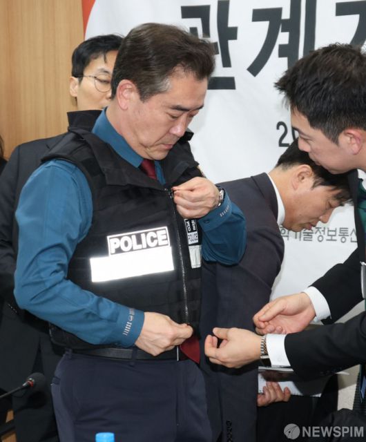[서울=뉴스핌] 양윤모 기자 = 디지털 기술기반 범죄예방기술 시연 및 MOU행사가 6일 오후 서울 도봉경찰서에서 개최된 가운데 윤희근 경찰청장이 차세대 방검 외근조끼를 착용하고 있다. 이번 행사는이종호 과학기술정보통신부 장관이 참석한 가운데 '과학기술·디지털을 통한 민생현장 소통'의 일환으로 디지털 기반 범죄안전 주요기술 시연, 디지털 기반 범죄예방 강화방안 발표, ‘과학치안 구현과 치안산업 진흥 협력을 위한 과기정통부-경찰청 간 업무협약’ MOU행사도 진행되었다. 2023.12.06 yym58@newspim.com